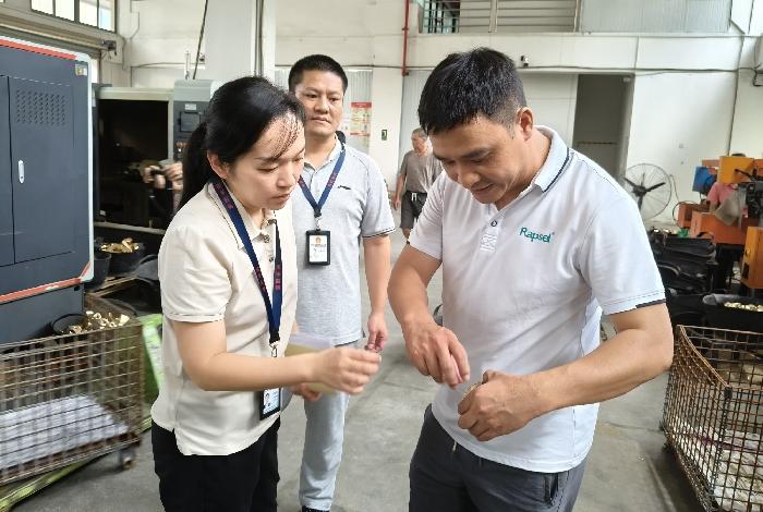 英都镇纪委监察组立足监督职责,深入一线了解企业在生产、经营中遇到的难点堵点问题,督促相关职能部门提升服务效能,为持续优化营商环境提供坚强纪法保障。图为日前,该镇纪检监察干部在辖区企业了解助企政策落实有关情况。